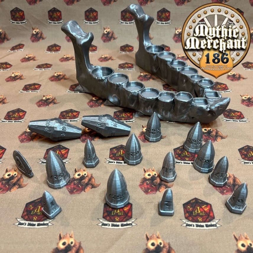 Dragon Tooth Dice are novelty dice. They are 3D-printed designs in a fantasy or role-playing theme and made from plastic. No other pictured items from the listing are included. They are available with or without holes for a necklace or keychain.